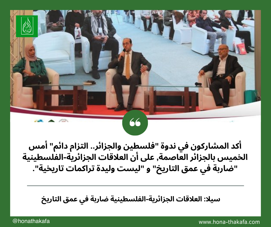 وخلال الندوة التي نظمت بمناسبة الطبعة ال27 لصالون الجزائر الدولي للكتاب, أكد البروفيسور أعراج سليمان, عميد كلية العلوم السياسية والعلاقات الدولية على أن دولة فلسطين حاضرة في كل المناسبات الجزائرية و أن العلاقات بين الشعبين الجزائري و الفلسطيني “ليست ظرفية مبنية على أهواء” و إنما هي “ضاربة في عمق التاريخ”, مشيرا إلى أن القضية الفلسطينية “تبقى قضية الأمة العربية و أن النضال من أجلها لن يتوقف”.