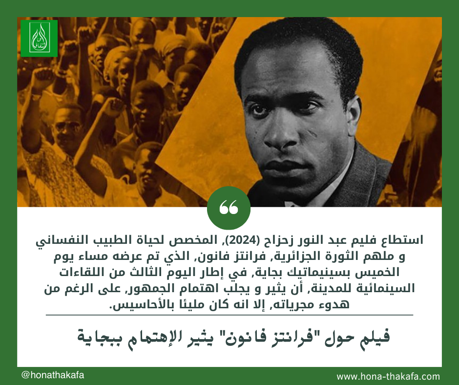 استطاع فليم عبد النور زحزاح (2024), المخصص لحياة الطبيب النفساني و ملهم الثورة الجزائرية, فرانتز فانون, الذي تم عرضه مساء يوم الخميس بسينيماتيك بجاية, في إطار اليوم الثالث من اللقاءات السينمائية للمدينة, أن يثير و يجلب اهتمام الجمهور, على الرغم من هدوء مجرياته, إلا انه كان مليئا بالأحاسيس.