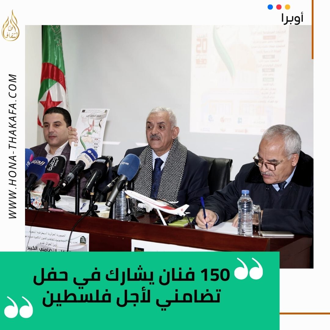 عقد مدير أوبرا الجزائر عبد القادر بوزارة ندوة صحفية الثلاثاء، حيث تطرق فيها إلى تفاصيل البرنامج الخاصة بالحفل التضامني الكبير “سلام لفلسطين” الذي سينظم يوم 20  جانفي بأوبرا الجزائر. وسيشارك في الحفل الذي يأتي في إطار ثقافة المقاومة 150 فنان، بقيادة المايسترو الجزائري لطفي سعيدي  والمايسترو السوري ميساك باغبودريان، موزعا في الفرقة الأندلسية لأوبرا الجزائر… متابعة قراءة 150 فنان يشارك في حفل تضامني لأجل فلسطين