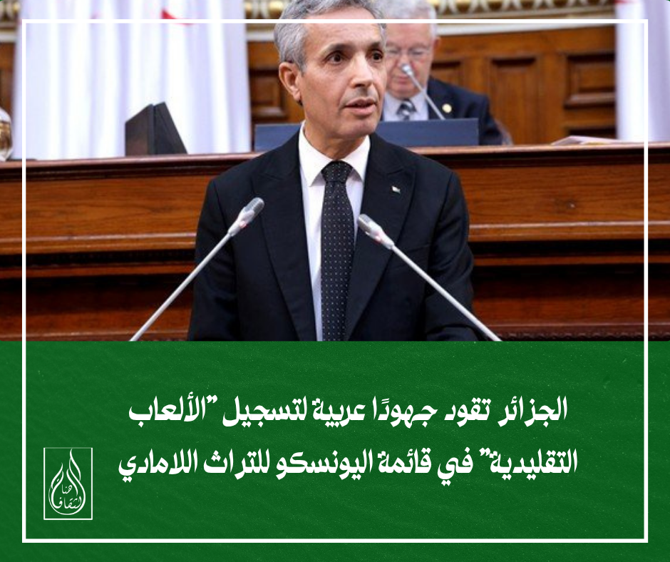 أعلن وزير الثقافة والفنون، السيد زهير بللو، اليوم الخميس بالجزائر العاصمة، أن الجزائر تعكف حاليًا على إعداد ملف “الألعاب التقليدية” لتقديمه باسم المجموعة العربية لتسجيله ضمن قائمة التراث الثقافي اللامادي للإنسانية بمنظمة اليونسكو. تعزيز التراث العربي المشترك خلال جلسة علنية بمجلس الأمة مخصصة للأسئلة الشفوية، أوضح السيد بللو أن “مسعى تسجيل ملف الألعاب التقليدية باسم… متابعة قراءة الجزائر تقود جهودًا عربية لتسجيل “الألعاب التقليدية” في قائمة اليونسكو